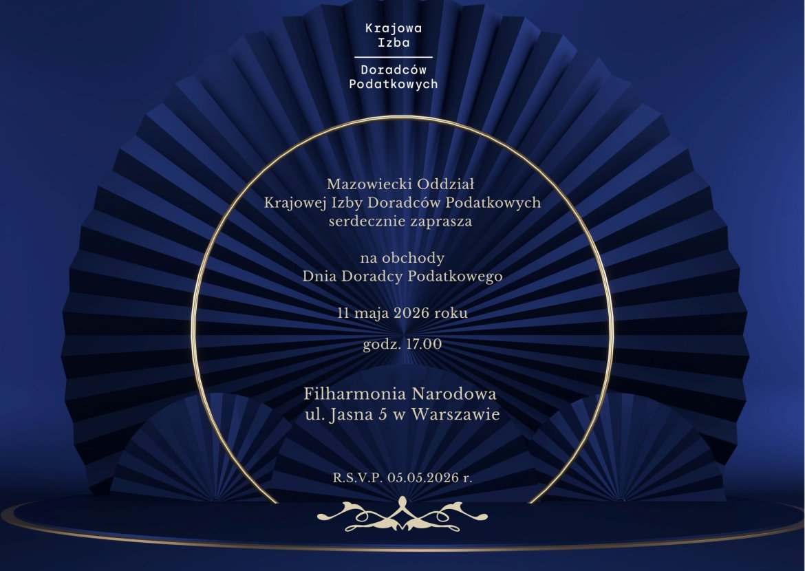Zarząd Mazowieckiego Oddziału Krajowej Izby Doradców Podatkowych serdecznie zaprasza wszystkich doradców podatkowych wraz z osobami towarzyszącymi na obchody Dnia Doradcy Podatkowego połączone z obchodami 30-lecia Krajowej Izby Doradców Podatkowych, które odbędą się 11 maja 2026 roku (poniedziałek) o godz. 17.00 w Filharmonii Narodowej (ul. Jasna 5, Warszawa).